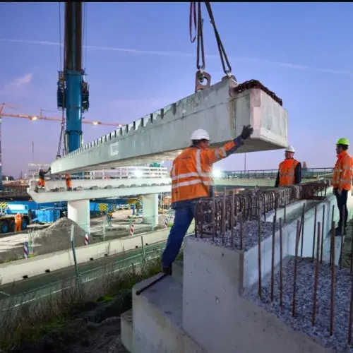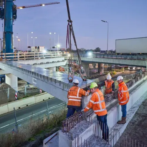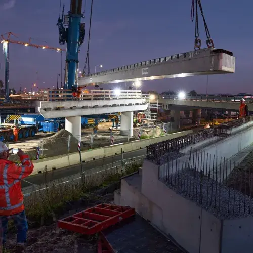 Deze eenvoud staat in schril contrast met de kopschuinte van 52 graden van de prefab betonliggers. Van Dijk: “Dan moet je bijvoorbeeld adequate oplossingen voor de voegverbindingen zoeken vanwege het bewegen van de brugdelen en vooral om het bandengeluid te beperken. We hebben de oplossing gevonden in 4 renovatievoegen en 5 buigslappe voegconstructies. Als de velden met prefab betonliggers in de eerste maanden van 2022 zijn gemonteerd, gaan we met het brugdek, de voegen en de verharding van de rijbanen aan de slag.”