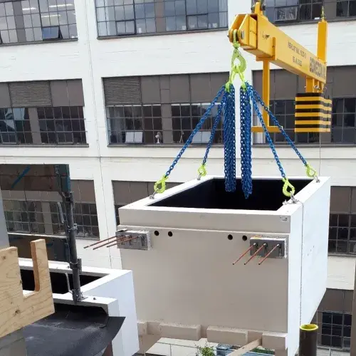 De projectmanager geeft aan dat gezamenlijk met hoofduitvoerder Rob Hofmans, senior werkvoorbereider Roy Raaijmakers en de andere betrokken partijen is gepuzzeld hoe de ruwbouw van de toren het beste kon worden opgetrokken en hoe prefab beton, tafelconstructie en plantenbakken op hun plek konden worden gehesen en konden worden verankerd. Want Stam + De Koning wilde bij dit project steigerloos bouwen. Er is daarom gekozen voor de inzet van tafelconstructies. De plantenbakken voor de bomen zijn gemonteerd op de balkon/constructieve vloer. De kleinere bakken voor de struiken rusten op een speciale staalconstructie die aan de onderzijde van de breedplaatvloeren is gemonteerd. Eén type plantenbak (type D) is door middel van drie typen Schöck Isokorf, waaronder het Idock. Systeem, aan vloer en gevel verankerd.