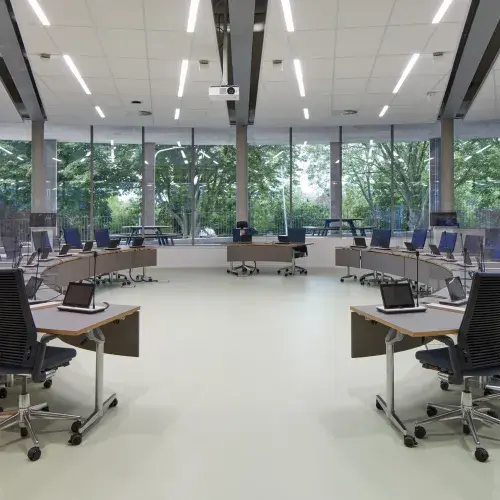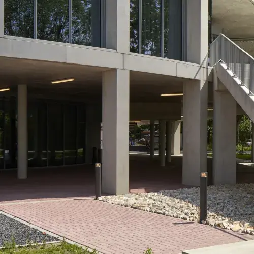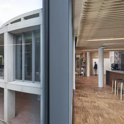 Het gebouw is april dit jaar in gebruik genomen en wordt eerdaags officieel en feestelijk geopend. Het is opvallend hoe de renders van het ontwerp en het uiteindelijke gebouw op elkaar lijken. Dat bewijst dat het doordachte ontwerp met de cirkels en colonnades met prefab betonnen kolommen een schot in de roos zijn.