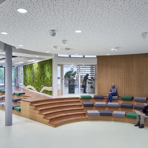 De architecten zijn zeer content met het resultaat en datzelfde geldt voor de gemeente en medewerkers. Het gebouw is prettig in het gebruik. Door de opvouwbare en verplaatsbare inrichting is de raadzaal multifunctioneel te gebruiken. Het gebouw voelt ook licht en transparant, mede door het vele daglicht. Zo zijn op het dak vier daglichttubes aangebracht die het daglicht diep in het levendige hart van het gebouw brengen. Maaike: “Het gebouw is gasloos en zeer energiezuinig, zelfs nul-op-de-meter. Op het dak liggen PV-panelen, er is driedubbelglas gebruikt en de benutting én het weren van de zoninstraling scheelt energie voor warmte en koeling. Het groene dak fungeert als regenwaterbuffer. Een grote groene wand in het gebouw zorgt voor een aangename luchtvochtigheid; ook de akoestiek wordt daarmee verbeterd.”