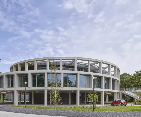 Cruciaal in die verbinding en het veelzijdige gebruik staat de ronde vorm van het gebouw. Doordat het gebouw rond is, heeft het gebouw een kleinere omtrek dan een rechthoekig gebouw bij dezelfde oppervlakte. Energiebesparing begint bij de gebouwvorm, want energie die je niet nodig hebt is de meest duurzame vorm van energie. Het gebouw heeft vanuit de ronde vorm een compacte buitenschil, dus weinig afkoelend oppervlak. Maaike: “De locatie leende zich perfect voor een rond gebouw, waarbij het van alle kanten zichtbaar is. Het ontwerp bestaat uit een reeks cirkels, waarvan de middelpunten ten opzichte van elkaar verschoven liggen. Terwijl ze op het ene punt elkaar raken, ontstaat er aan de overzijde ruimte tussen de verschillende cirkelbogen. Dit resulteert aan de zuidzijde in een overdekte buitenruimte, die zowel een beschutte entree als een vaste zonwering biedt. Er ontstaat ook ruimte voor buitenterrassen.”