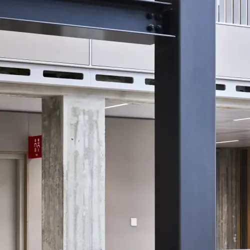 Hess: “Vervolgens is er gekeken naar de betonnen constructie van het deel van het oude kantoor dat binnen deze uitgangspunten paste en werd dit getoetst op toekomstbestendigheid. De criteria hiervoor waren vrije hoogte, vlakke vloeren (ook aan de onderzijde, om in de toekomst flexibel met leidingen en kanaalverloop om te kunnen gaan), het draagvermogen en de mogelijkheid om later kleine en grote gaten in de vloer te kunnen maken, bijvoorbeeld voor mogelijke schachten of vides voor nieuwe trappen. Zo is een kwart van het bestaande betoncasco hergebruikt. Dit resulteert in een gebouw waarin verschillende tijdslagen terug te zien zijn door de combinatie van oude en nieuwe materialen.”