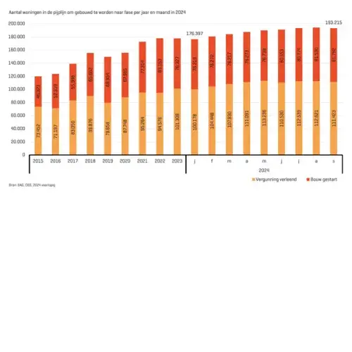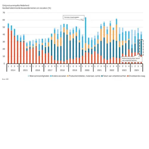 Tijdens de bijeenkomst van Buildsight op 11 december, vertelde Michel van Eekert dat de uitvoerbaarheid van de plannen om 100.000 woningen te bouwen een grote uitdaging blijft: "De minister zet volop in op prefab en industrialisering van de woningbouw. Daar zit ’m niet zozeer het probleem. De grote vraag blijft echter wie verantwoordelijk zal zijn voor de ontwikkeling en bouw van deze woningen." Hij doel op de woningcorporaties of op de bouwers voor de markt. De sector heeft ook andere uitdagingen, zoals netcongestie, stikstofregels, arbeidskrapte en een tekort aan geschikte bouwlocaties, die aandacht vragen (zie illustraties). "Op dit moment bouwen we 60.000 tot 65.000 nieuwbouwwoningen, en dat stijgt de komende jaren naar 70.000. Daarmee wordt de ambitie maar deels ingevuld. Hoewel de seinen voor groei op groen staan, zijn er ook remmende factoren. Vooral de beperkte beschikbaarheid van arbeidskracht zet een rem op de groei. “Als de sector erin slaagt om een groter deel van de bijna 26.000 openstaande vacatures in te vullen, zou het herstel nog aan kracht kunnen winnen. Licht herstel wordt pas in de tweede helft van 2025 verwacht”, zegt Van Eekert.