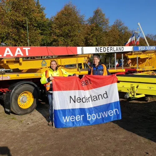 Marcel Bettonvil en Hans Mascini met de vlag #LaatNederlandweerBouwen.