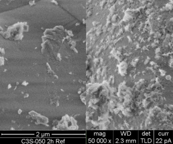 Wat Sonocrete uniek maakt, is de controle op microschaal, zie foto's. Dit betekent dat elke fase van de cementhydratatie optimaal kan worden gestuurd, wat cruciaal is voor prefabproducten zoals keerwanden, waar continuïteit en kwaliteit centraal staan. Optimalisatie op deze schaal vertaalt zich direct naar efficiëntere productie en een betrouwbaarder eindproduct. Op onbehandeld beton (links) zijn slechts enkele calcium-silicium-hydraat (C-S-H) clusters zichtbaar. C-S-H clusters zijn de microscopische bouwstenen die beton zijn sterkte en stevigheid geven. Na behandeling met Sonocrete, twee uur na het begin van het hydratatieproces, zijn veel C-S-H-clusters gevormd die gelijkmatig over het oppervlak zijn verspreid, duidelijk zichtbaar in vergelijking met het referentiemonster.