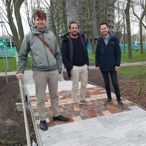 Dat de brug op het terrein van The Green Village ligt is geen toeval. Tim Jonathan, manager operaties en realisaties van The Green Village (rechts op de foto): ,,Wij bieden een plek aan partijen die duurzame producten en diensten leveren. We zijn een innovatief en duurzaam fieldlab, een fysieke locatie. Door het in de praktijk toe te passen, brengt het ontwikkelingen dichter bij de mensen.” Dat kan van de brug zeker gezegd worden, want die ligt op een druk gebruikte fiets- en looproute op het campusterrein. Voor het plaatsen van de brug kwamen de initiatiefnemers terecht bij BAM Infra Nederland. Daarnaast zijn er verschillende andere bedrijven betrokken bij de brug, zoals C2CA, Strukton Prefab, Jansen Beton, SQAPE en Zilverschoon Randwijk.