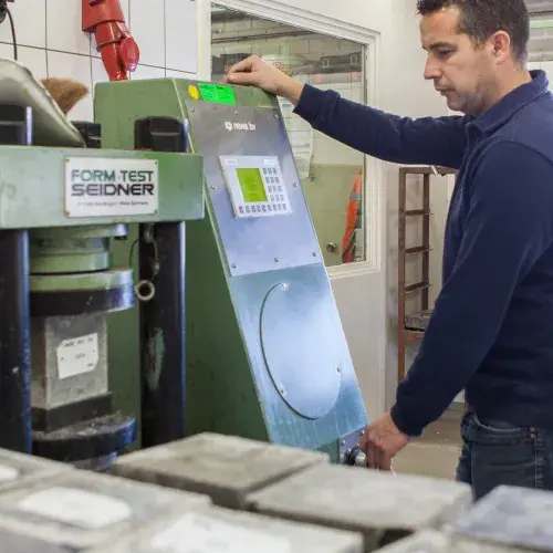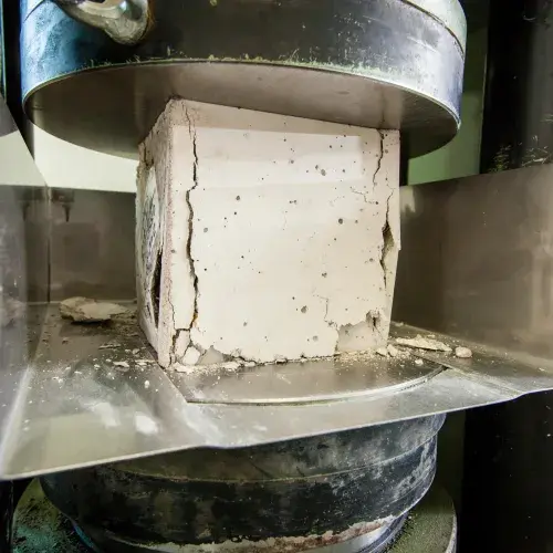 Betontechnoloog meet de kubusdruksterkte. Deze verwijst naar de maximale drukbelasting die een standaardkubusvormig betonmonster met zijden van 150 millimeter kan weerstaan voordat het bezwijkt.
