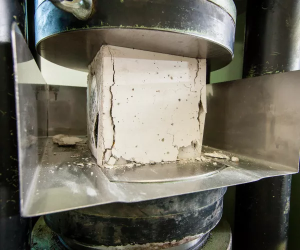 Betontechnoloog meet de kubusdruksterkte. Deze verwijst naar de maximale drukbelasting die een standaardkubusvormig betonmonster met zijden van 150 millimeter kan weerstaan voordat het bezwijkt.