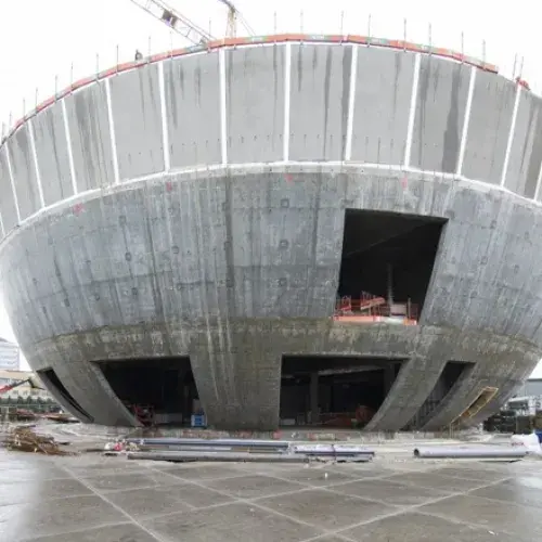 Toen de onderste ringen uit de bekisting kwamen, waren de zeer grote uitsparingen in de gevel goed zichtbaar (foto: BAM Bouw en Techniek / Rob Glastra)
