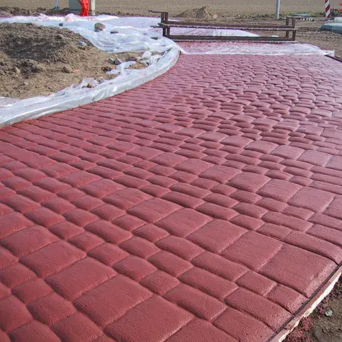 | Printbeton | Pas gestort verdicht betonmortel, eventueel in kleur, waarin met matrijzen of rubberstructuurmatten een patroon wordt aangebracht |