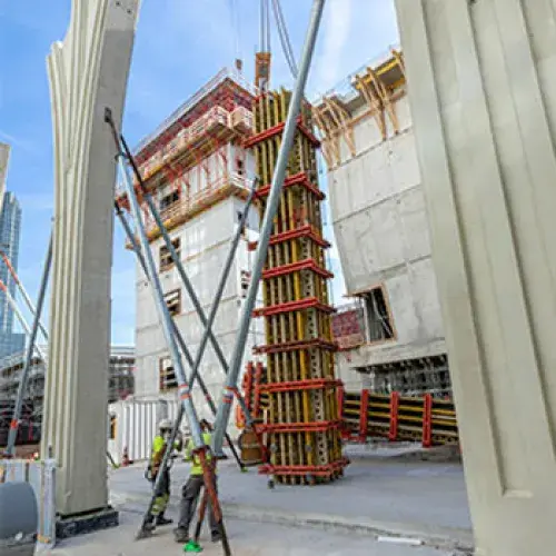 Voorgemonteerde PERI VARIO GT 24 kolombekisting met een hoogte van 9,6 meter.