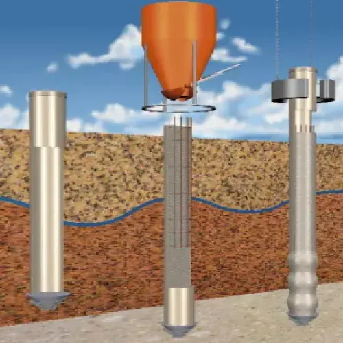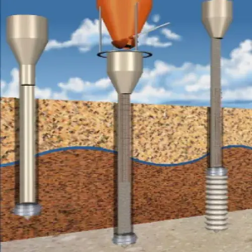 Grondverdringende betonpalen worden vervaardigd met behulp van een tijdelijke stalen hulpbuis die schroevend wordt ingebracht. Deze palen worden onder veel verschillende merknamen geleverd.