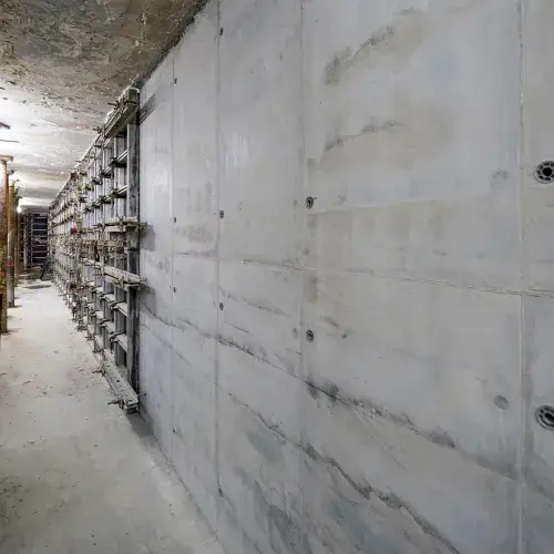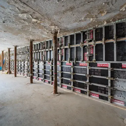 Voor de bekistingtechniek van deze wanden zocht Van Hattum en Blankevoort een oplossing die niet alleen handzaam en gemakkelijk te verwerken is, maar ook een betondruk tot 65 kN/m2 kon dragen. NOE-Bekistingtechniek bood met het NOE Alu bekistingsysteem een oplossing die aan beide voorwaarden voldoet. Deze lichtgewicht aluminium wandbekisting kan eenvoudig worden verwerkt en is toch bestand tegen hoge betondrukken. Bij de ontwikkeling van NOE Alu is uitgegaan van een systeem dat met de hand kan worden getransporteerd, maar dat tegelijkertijd aan de vereiste betonstortdruk van de bouw kan voldoen.