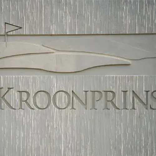 De kopse kant van de driving range is gelegen aan de parkeerplaats. Hier valt direct het logo van de golfbaan op dat in de betontextuur is verwerkt. NOE-Betonvormgeving is gespecialiseerd in de uitvoering van beeldmerken en merknamen in beton en ontwikkelde voor de golfbaan een oplossing die direct kon worden meegestort. Opmerkelijk is de verspringende reliëfdiepte die het logo extra benadrukt. Wat verder in het oog springt, zijn de uitstekende vlag en het woordmerk die doorlopen in de textuur van de betonnen wand van de driving range. Om het logo mee te kunnen storten, is dit door middel van CNC-techniek en computergestuurd frezen in de structuurmat verwerkt.