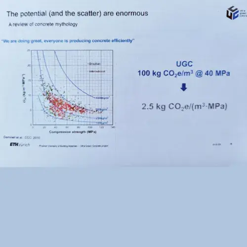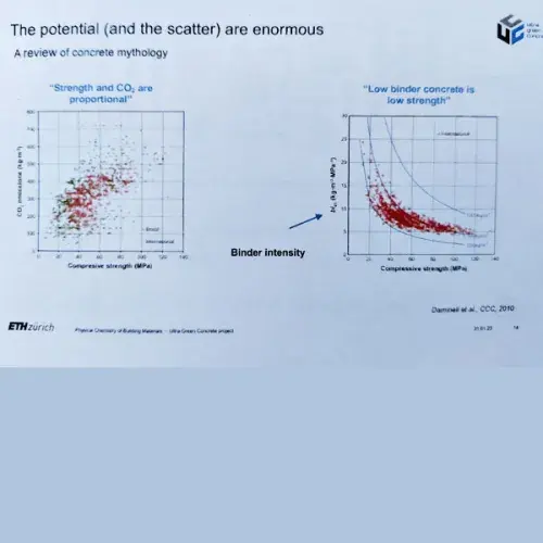 De cursus werd gegeven door prof. Karen Scrivener en een aantal van haar promovendi. Karen Scrivener is onder meer bekend van het rapport van de United Nations Environmental Program (UNEP) uit 2017 over Eco-efficient cements. Haar afdeling materiaalkunde heeft de laatste jaren veel gewerkt aan het LC3-50 concept waarbij beton met een aanzienlijk lagere footprint kan worden gemaakt. Het getal vijftig in LC3-50 staat voor vijftig procent van de Portlandcement vervangen door kalksteenmeel en gecalcineerde klei. Dit mengsel heeft een 40% lagere footprint dan een mengsel met 100% Portland cement. “In Nederland kijken we hier niet zo erg van op natuurlijk omdat Portlandcement meestal al wordt gemengd met hoogovenslak. Maar hoogovenslakken zijn beperkt beschikbaar en in de toekomst al helemaal niet meer, omdat de staalindustrie haar proces zal gaan wijzigen”, aldus Jan de Koning. LC3-50 is vooral van belang voor het zuidelijk halfrond waar er een enorme vraag komt naar beton (Red. o.a. Afrikaanse landen) en er ook veel klei aanwezig is. Maar door de snel stijgende prijzen van hoogovenslak en samengestelde cement wordt LC3-50 misschien in het noordelijk halfrond snel interessant. De conclusie is dat de afdeling van Karen Scrivener heel veel kennis heeft opgedaan van dit nieuwe mengsel en dat LC3-50 zich op alle fronten kan meten met het 100% Portland mengsel. Dus LC3-50 heeft ook een druksterkte op 28d van 70MPa, de duurzaamheidstests zijn net zo goed e.d. Behalve de sterkte op 1 dag. Maar hier wordt aan gewerkt.