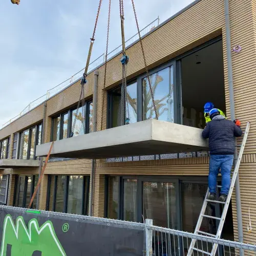 Hoco Beton heeft produceert voor verschillende projecten in Nederland balkons die makkelijk weer los te maken zijn. Luc Op de Beke, adjunct-directeur van het bedrijf: ,,Het mooie aan deze oplossing is dat je de balkons eenvoudig opnieuw kunt gebruiken. Dat is het circulaire element. Zo kun je balkons een tweede leven geven in een ander gebouw. Met het later aanbrengen van balkons blijft dit esthetische beton ook mooier, omdat je na de ruwbouw zit.”