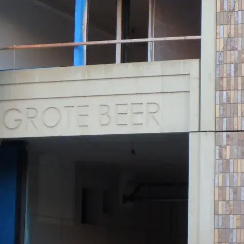 Het gebouw De Grote Beer is aan de randen van de elementen met steenstrips geel gekleurd.