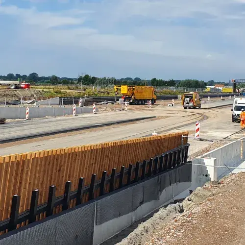 De keerwanden vormen een onmisbare schakel in de aanpak van de bouw. Bovenop de gewapende grondconstructie - langs het verdiepte tracé - fungeren ze als grondbak voor een mix van groenblijvende beplanting. Dit zorgt voor een natuurlijke, groene wand. De houten lamellen die aan de wanden en de betonnen elementen worden bevestigd, fungeren als drager van de beplanting en als valbeveiliging.