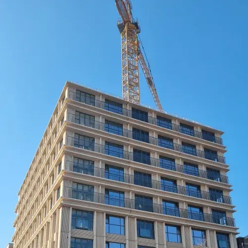 De vullaag is uitermate geschikt om alle installatieleidingen in te verwerken. Zo is sprake van een volledige ontkoppeling van ruwbouw en installatietechniek. Op de vullaag komt nog een zwevende dekvloer en de vloerverwarming. Zo bewerkstelligen we een perfect pakket dat aan alle eisen voor geluidreductie in en tussen de appartementen voldoet. De projectleider vervolgt: “Met het plaatsen van vloeren, wanden en gevelelementen heb je een stabiel casco. De horizontale en verticale trekbanden volgens de Eurocode zijn gemakkelijk te realiseren. Het casco is ook direct wind- en waterdicht, zodat drie bouwlagen onder de montagelaag de installatie- en afbouwdisciplines aan het werk kunnen. Dit draagt bij aan de hoge bouwsnelheid. En elke discipline kan z’n werkzaamheden verrichten op een volledig vlakke vloer. Dit vergemakkelijkt het werk en voorkomt fouten.”