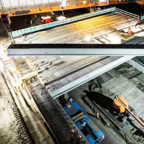 “Vanwege de vormgeving van het viaduct en de architectonische eisen was het een uitdaging om bij dit viaduct gangbare liggers toe te passen,” vertelt Hendrik Herder van Haitsma Beton. “Bij dergelijke kunstwerken worden doorgaans rechte liggers gebruikt. Voor dit werk was dat niet mogelijk: de architect wilde aan de onderzijde van het viaduct een maximale en constante voegbreedte. In zo’n geval kun je kiezen voor kromme prefab liggers, echter brengen deze een aanzienlijke financiële investering met zich mee. Daarom hebben we hier voor dit werk de hoedligger geïntroduceerd. Dankzij de hoedliggers kun je met rechte liggers kromme dekken maken. Dat komt omdat we aan de onderzijde van de rechte liggers betonnen flappen hebben gemaakt, die hol en bol kunnen zijn. Op die manier kunnen we de krommingen in dit kunstwerk volgen.”