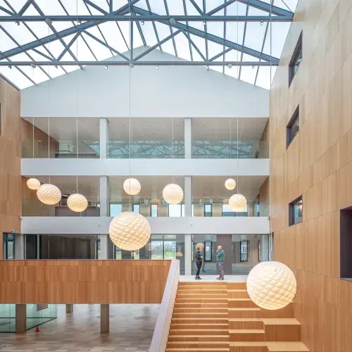 Dit is gerealiseerd door een betonnen prefab fundering in te zetten waarbij cementarm bindmiddel is toegepast. We hebben gekozen voor deklagen op de prefab kanaalplaten die eveneens met dit cementarme beton zijn vervaardigd. Er zijn kanaalplaten ingezet die een groen label hebben omdat ze significant bijdragen aan een goede MPG-score. En last but nog least; het volledige prefab betoncasco (met gevelelementen, kolommen, binnenwanden, bordessen en trappen) is uitgevoerd met een maximaal percentage secundaire grondstoffen binnen de grenzen van technische mogelijkheden. Alleen de prefab betonpalen hebben vanwege de draagkrachteisen een vertrouwde betonsamenstelling.