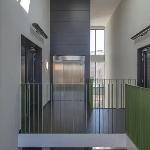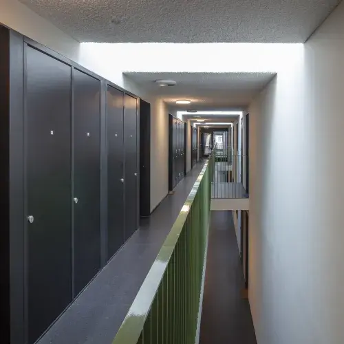 Er wonen thans met name young professionals die in een gevorderd stadium van hun studie zitten en daarnaast bijvoorbeeld een eigen bedrijf zijn gestart. Zo zit er iemand die een stropdassenfabriek heeft opgericht. “Het is prettig vertoeven in het gebouw. We laten veel daglicht toe via een kokerconstructie bovenin de twee verdiepingen hoge corridor en elk appartement heeft een Frans balkon. Het interieur van de gebouwen is voorzien van een terughoudende groene kleur die refereert aan de Duitse industriegebouwen. Hier even geen felle kleuren die normaliter in studentenhuisvesting worden toegepast. Het gaat om sociale huisvesting; mijn insteek daarbij is dat je zorgt voor een plezierige woonomgeving voor de gebruikers en dat opdrachtgever DUWO een gebouw bezit dat voor de lange termijn mogelijkheden biedt.”