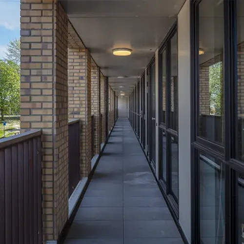 De constructie van de gebouwen is opgetrokken in een combinatie van het prefab betonnen stramien voor de gevelconstructie, breedplaatvloeren met stortvloeren en -wanden en prefab betonnen trappen. “Ik wil de begane grond van een gebouw graag iets optillen ten opzichte van het maaiveld. Maar we waren hier gebonden aan een maximale bouwhoogte en we moesten qua exploitatie minimaal vier lagen appartementen realiseren. Daarom is de vloerconstructie zo dun mogelijk gekozen in combinatie met kleinere overspanningen in het patroon van de 4,4 meter brede en 2,5 meter hoge portaalconstructie. Zo pasten alle wensen. Verder wilde ik geen galerijgevel voor het grotere gebouw, mede omdat dit aan alle zijden aan een zichtomgeving grenst. Het grotere gebouw heeft een binnencorridor gekregen waarbij maisonnettes (88 m2) aan voor- én achterzijde van het gebouw liggen, als aanvulling op de begane grond woningen (74 m2). De opzet is zodanig dat je eenvoudig een groot appartement kunt indelen in drie studentenkamers met gemeenschappelijke woonkamer, keuken en douche. De gebouwen bieden flexibiliteit voor nu en voor de toekomst.”